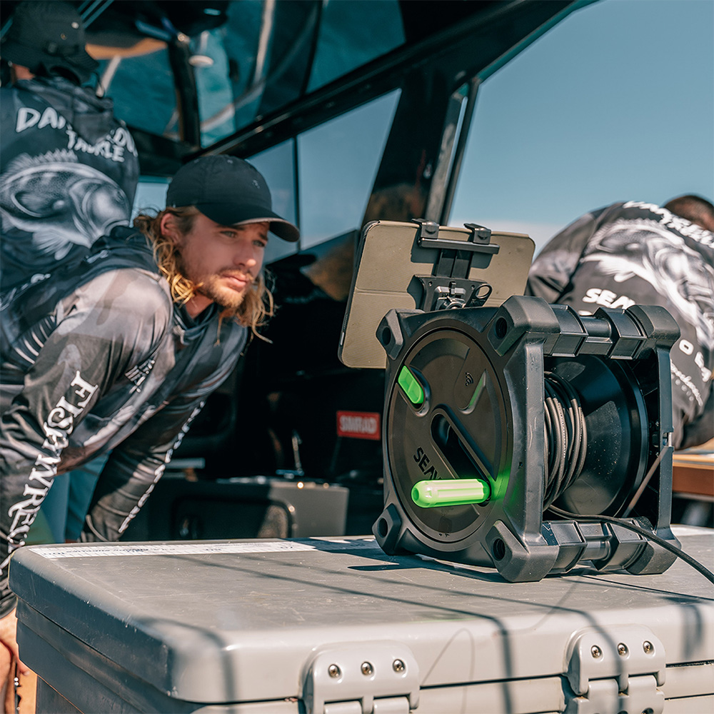WiFi 信号无法在水中传播,因此 Seavu 系统采用了定制的防水系绳和发射器装置。您的相机会实时捕捉水下画面,同时将信号传输到水面接收器,接收器连接到您的手机或平板电脑。