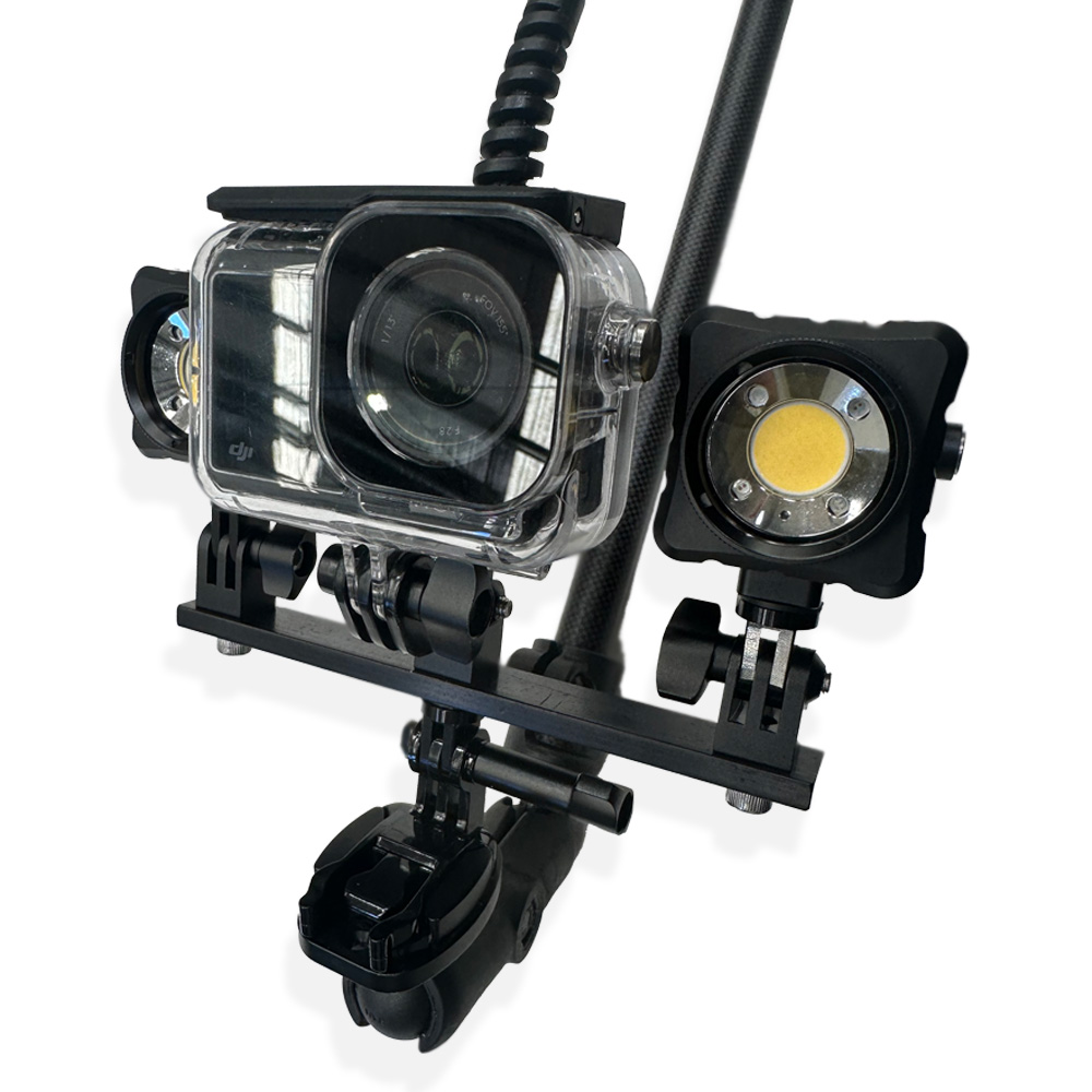 这些灯可以直接安装在 Seeker DeepScope 钻机上,无需使用安装臂。对于其他应用,这些灯可以安装在随附的船用级铝制安装臂上,该安装臂底部有一个 GoPro 式安装座,顶部有三个安装座(两个用于安装灯,一个用于安装 Seeker)。这使您能够灵活地将灯部署在各种不同的装置上,包括杆子、鳍片、钻机和其他 Seavu 配置。